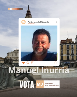Manuel Inurra Contacto con Aragón desde hace 45 años y residencia desde casi 30 en Pirineo Aragones, en actividades relacionadas con turismo y naturaleza. Milito en M+J porque soy consciente de la importancia de la política en nuestras vidas, pero no me gustan los políticos al uso. Creo en el poder de los movimientos sociales y en que la política debería hacerse de abajo hacia arriba, y no al revés. Apoyo a un partido que se centra en las personas, respetando y exigiendo sus derechos o obligaciones sin tener en cuenta sexo, raza, origen, religión, y que lo ha demostrado siendo capaz de promover una Iniciativa Legislativa Popular para regularizacion después de conseguir casi 700 000 firmas, que esperamos se apruebe algún dia. Nos presentamos a estas elecciones para hacer llegar a la sociedad el mensaje de que es posible una política sin agresiones, colaborando con todas las fuerzas para lo que realmente importa, mejorar las condiciones de vida de las personas que forman nuestro territorio, cuidando el delicado equilibrio entre el desarrollo económico, industria, tecnologia y medio rural y entorno natural.